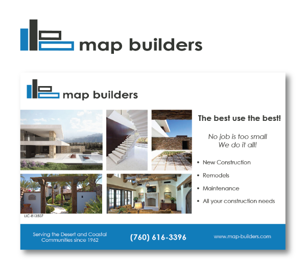 Logo design for Map Builders, a modern architectural design company out of Southern California. The small advertisement was designed for an architectural advertising magazine.